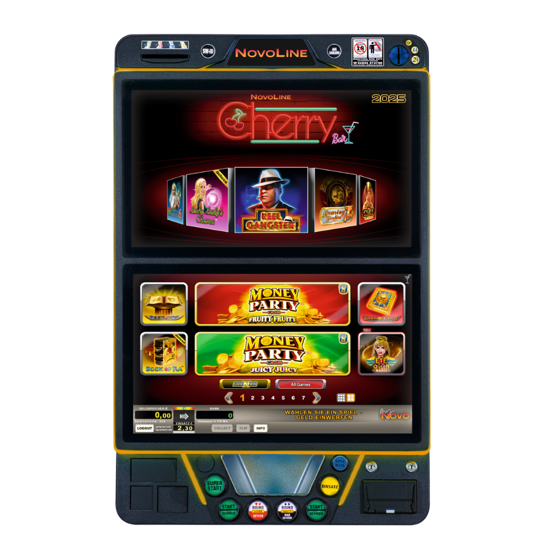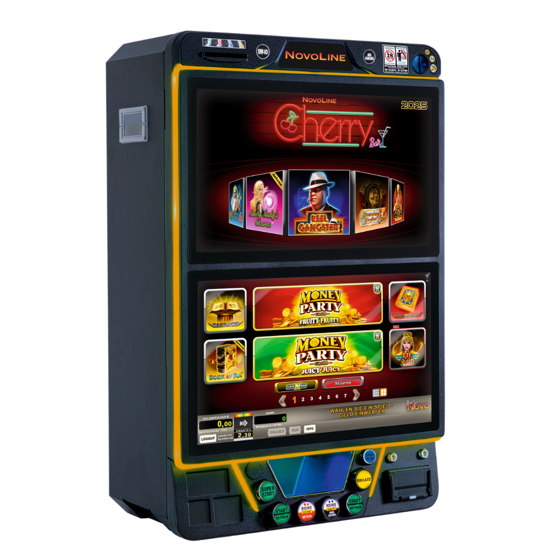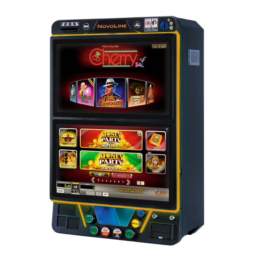 Das Novoline WALL-Gehäuse bringt hochwertige Technik und elegantes Design in besonders kompakter Form an die Wand. Das mattschwarz lackierte Wandgehäuse ist mit zwei 24-Zoll-Full-HD-Monitoren mit PCAP-Technologie ausgestattet und sorgt für ein brillantes, klares Spielerlebnis – auch bei begrenztem Platzangebot.